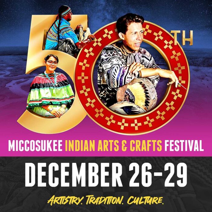 The vibrant culture of Native American Tribes comes alive in a four-day celebration in the heart of the Florida Everglades. You’re invited to the 50th Annual Miccosukee Indian Arts & Crafts Festival, December 26th through the 29th, at the Miccosukee Indian Village festival grounds.