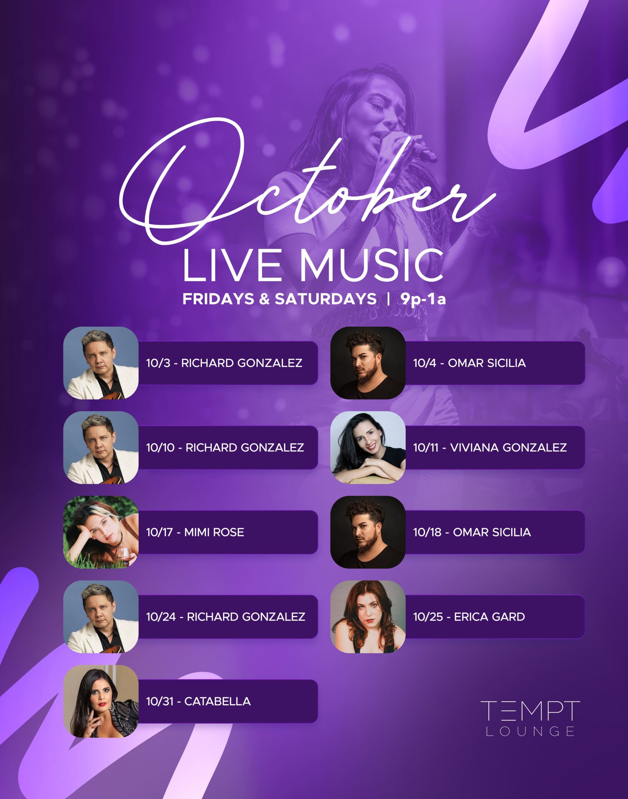 Enjoy live music every Friday and Saturday at 9p, showcasing Miami’s best salsa, pop, and jazz performers.