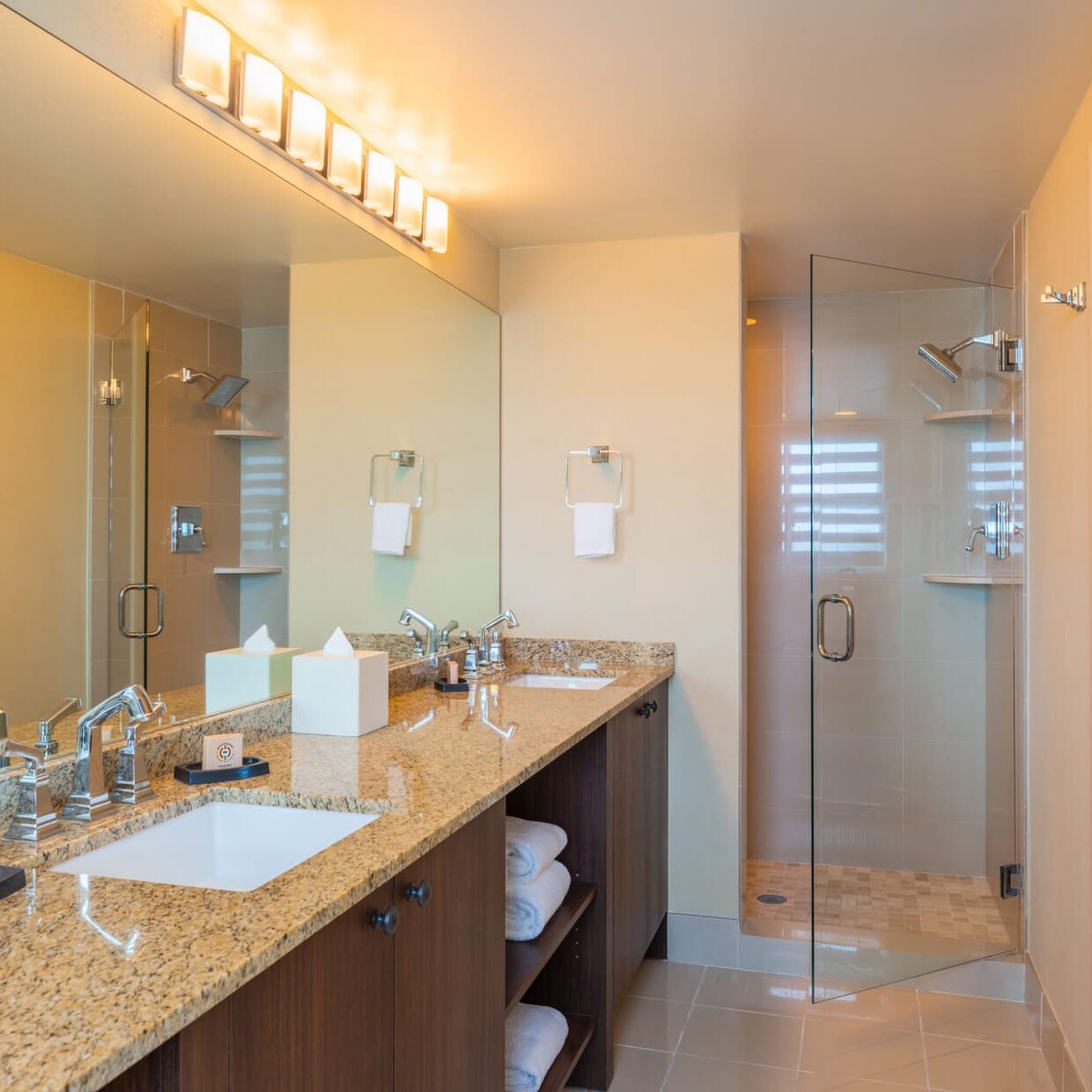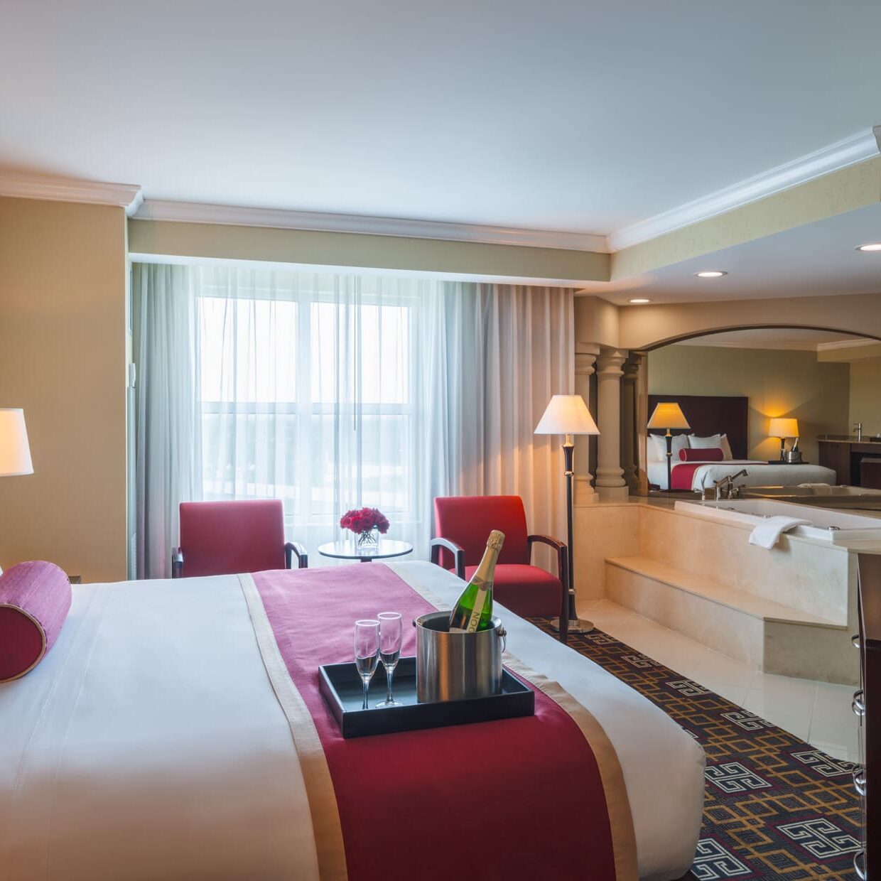 This romantic suite exudes charm and elegance, featuring a luxurious king bed and a jacuzzi steps away. Additional comforts include a 65" TV, refrigerator, and microwave.
