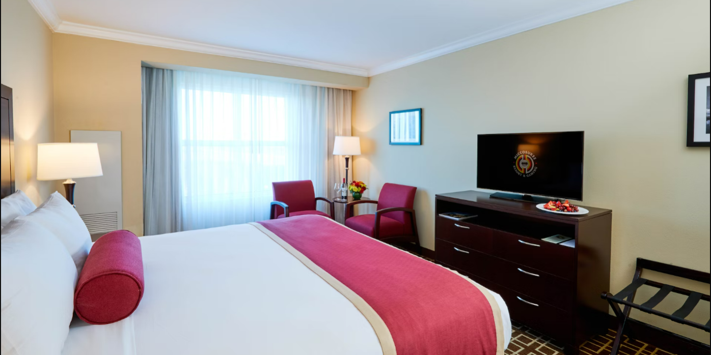 When a king bedroom is what you desire, this Deluxe Level room fits you perfectly. You’ll enjoy the ultramodern bathroom as well. Also includes two night tables and 42″ plasma TV.
