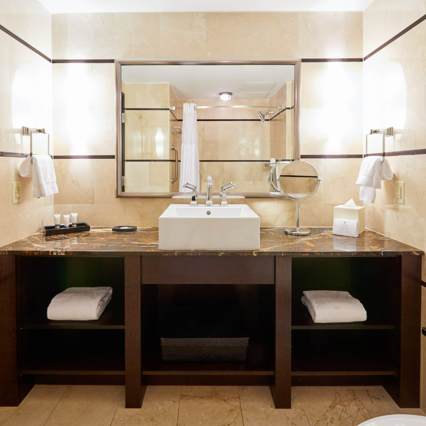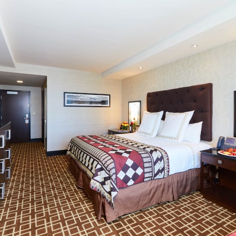 When a king bedroom is what you desire, this Executive Level room fits you perfectly. You’ll enjoy the ultramodern bathroom and plush couch. Also includes two night tables and 42″ plasma TV.