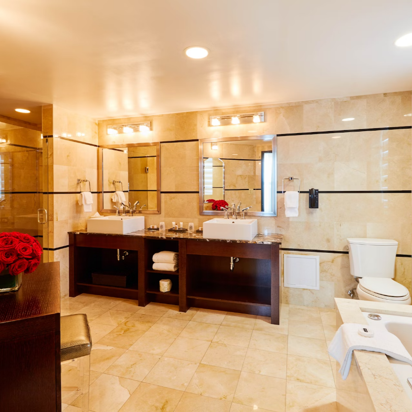 Guests staying in this room will have their own king bed, spacious bathroom with Jacuzzi, large glass enclosed shower, activity and console tables with chairs, generous armoire, a makeup table and more.