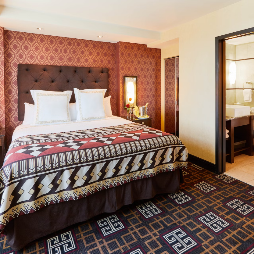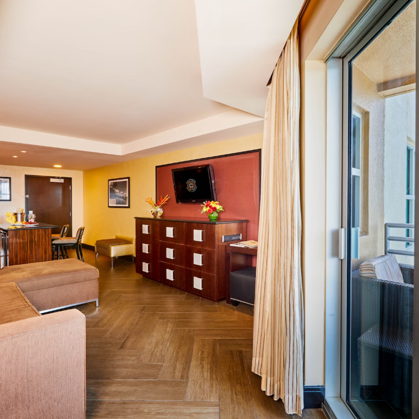 Here, you’ll have a separate living area, wet bar with stools, king bed, sleeper sofa, majestic armoire, plenty relaxing chairs as well as a refrigerator and a microwave.